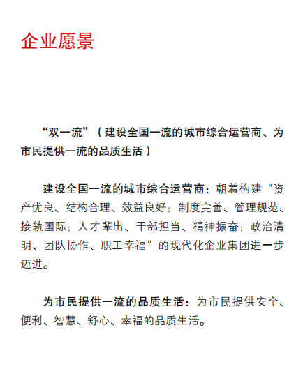 企業(yè)愿景:“雙一流”(建設(shè)全國一流的城市綜合運(yùn)營商、為市民提供一流的品質(zhì)生活)