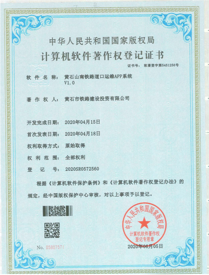 黃石山南鐵路道口無人值守技術(shù)共申請國家級8項(xiàng)專利技術(shù) ,其中《黃石山南鐵路道口智能化控制系統(tǒng)》、《黃石山南鐵路道口列車車載聯(lián)動顯示系統(tǒng)》、《黃石山南鐵路道口調(diào)度中心綜合監(jiān)管系統(tǒng)》、《黃石山南鐵路道口運(yùn)維APP系統(tǒng)》4項(xiàng)成果已取得計(jì)算機(jī)軟件著作版權(quán)登記。