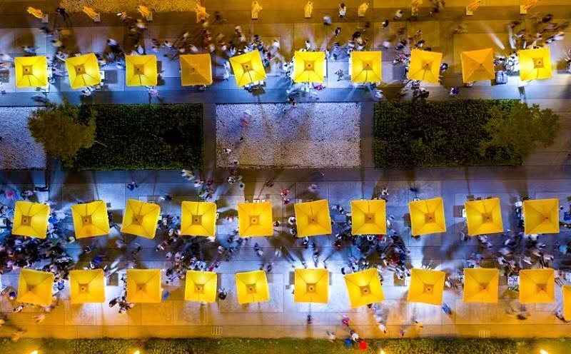 于是就形成了一個(gè)有趣的現(xiàn)象,在文創(chuàng)手作區(qū)里,道路中間不斷有人流湍急涌動(dòng),而觸碰到每朵“小黃傘”時(shí),又自發(fā)形成一個(gè)個(gè)人群包圍圈,如同花瓣般層層盛開。