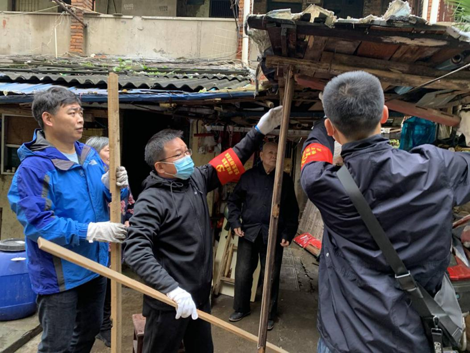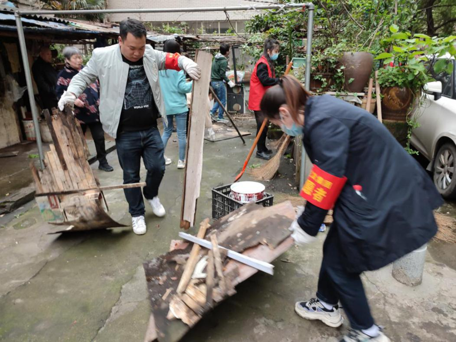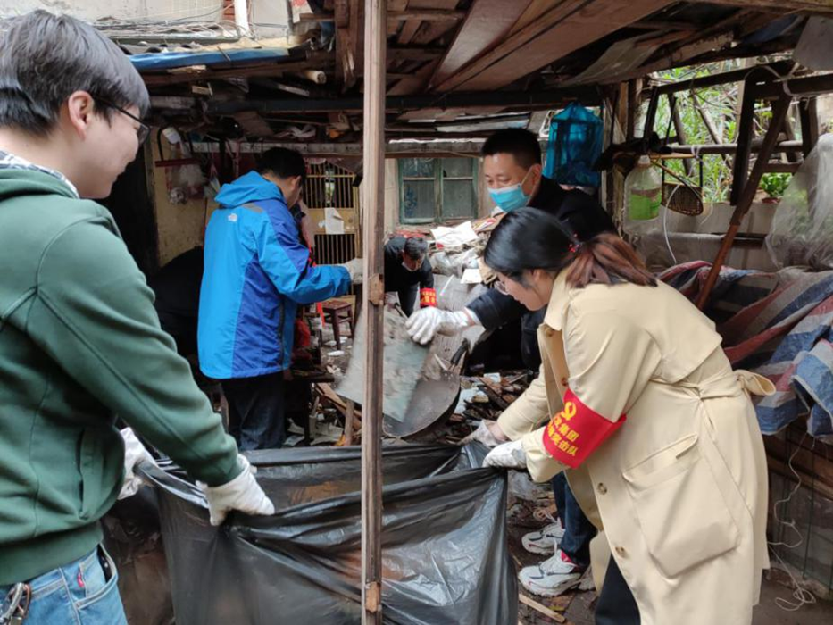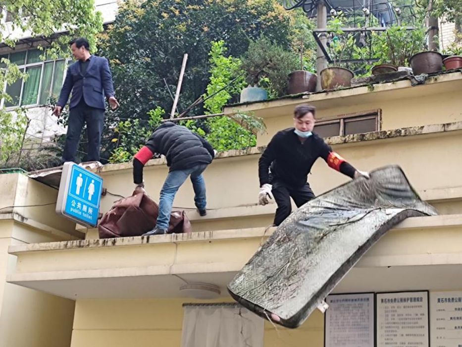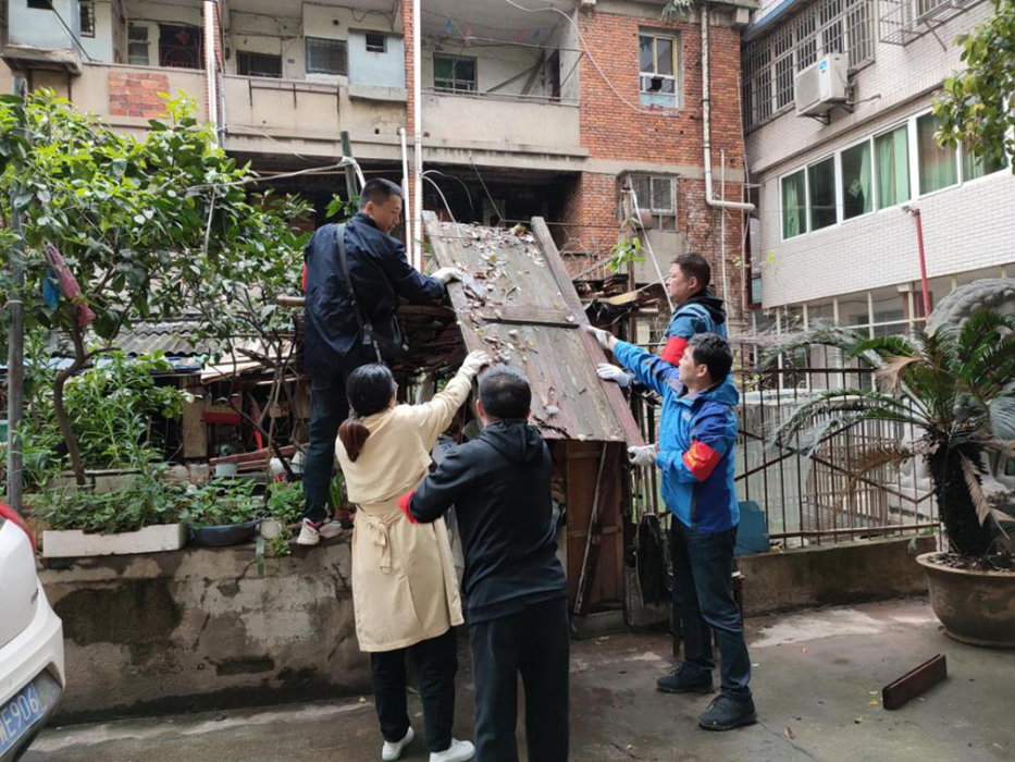 在社區(qū)工作者的引導(dǎo)下,大家分工協(xié)作,耐心勸導(dǎo)私搭亂建的居民,并對(duì)轄區(qū)內(nèi)的公共場(chǎng)所亂搭亂建、垃圾雜物等進(jìn)行集中清理。志愿者們有的清理居民樓下亂搭的雨棚,有的清理公共廁所頂上的雜物、還有的志愿者在清理依山而建樓梯上的垃圾。