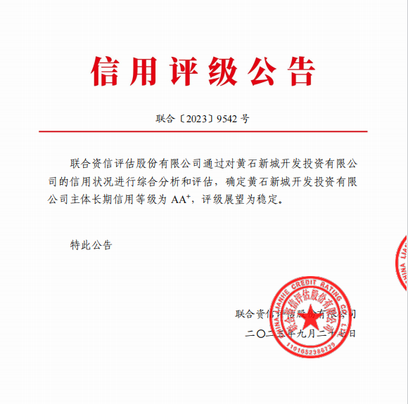 9月27日,經(jīng)國(guó)內(nèi)權(quán)威評(píng)級(jí)機(jī)構(gòu)聯(lián)合資信評(píng)估股份有限公司綜合評(píng)定,黃石新城開(kāi)發(fā)投資有限公司(以下簡(jiǎn)稱(chēng)“黃石新開(kāi)投”)榮獲AA+主體信用等級(jí),評(píng)級(jí)展望為穩(wěn)定,至此,黃石城發(fā)體系成為黃石市唯一一家母子公司同時(shí)擁有AA+主體信用等級(jí)的國(guó)有企業(yè),且是湖北省內(nèi)第一個(gè)國(guó)有企業(yè)二級(jí)子公司直接獲評(píng)AA+主體評(píng)級(jí)的地級(jí)市。